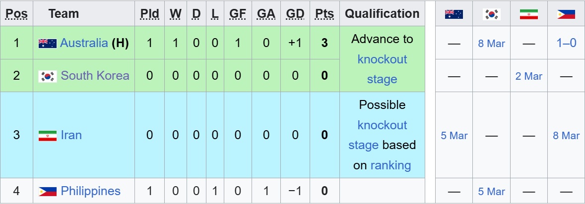 Group A ...Team ....................Pld . W . D . L . GF . GA . GD . Pts 1 Australia (Host) ... 1..... 1... 0 . 0 .. 1 ... 0 ... +1 ... 3 2 Korea .................... 0 .... 0 .. 0 . 0 .. 0 ... 0 .... 0 .... 0 3 Iran ....................... 0 .... 0 .. 0 . 0 .. 0 ... 0 .... 0 .... 0 4 Philippines ........... 1 .... 1... 0 . 1 .. 0 ... 1 ... -1 .... 0 https://i.postimg.cc/hPmNnvPR/Group-A.jpg Korea vs Iran March 2, 2026 19:00 (Australian Eastern Time) Gold Coast Stadium, Gold Coast, Queensland, Australia