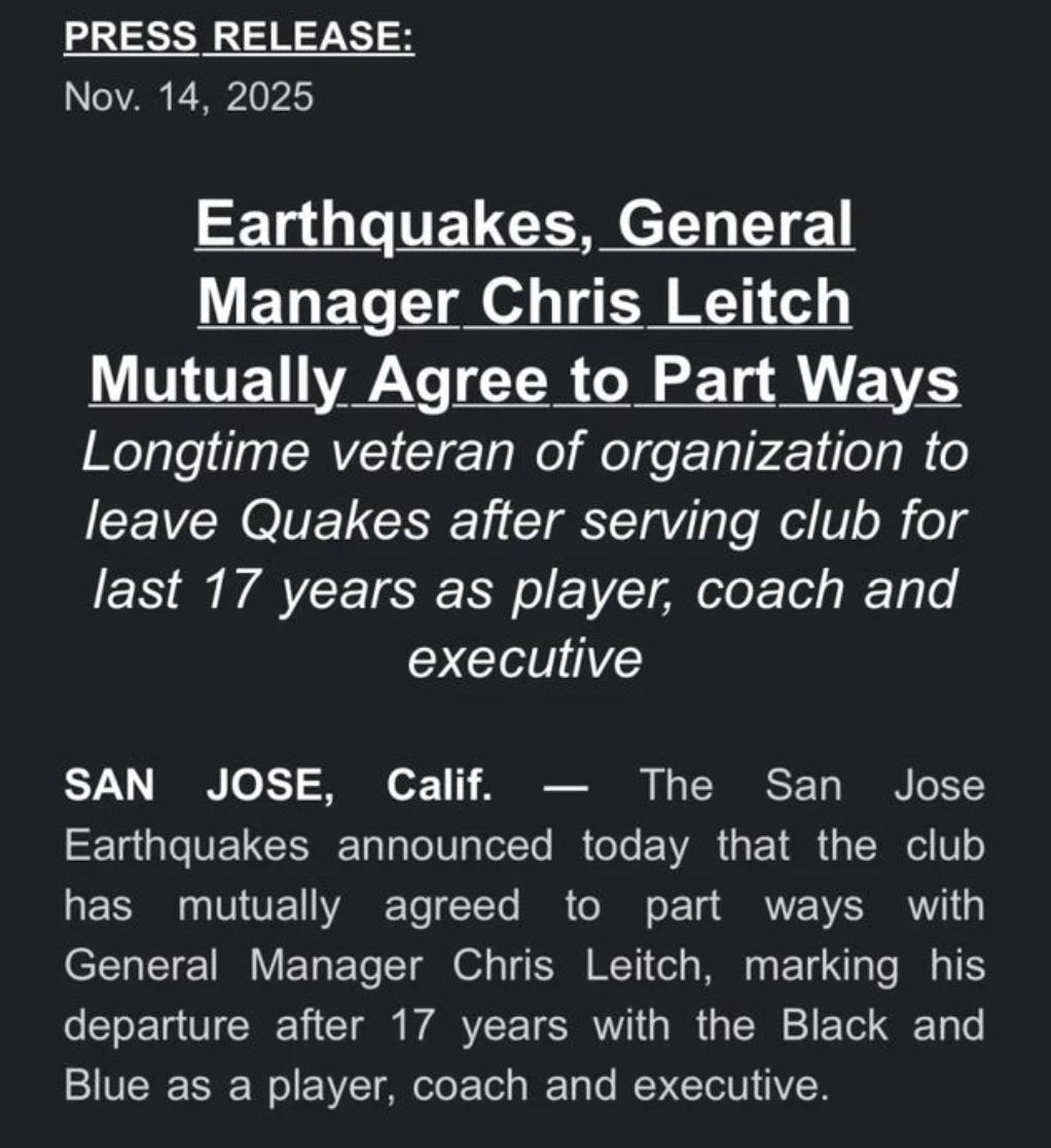 Do you have any evidence to support that, is there a single source anywhere refuting the reports? Also: Which is why the Quakes immediately parted ways with Leitch?? Check out the dates on these two tweets: November 12, Tom Bogert: Quakes "didn't pick up his 2026 option before contract's deadline passed." 🇦🇷 Sources: San Jose Earthquakes star Cristian Espinoza is a free agent, as club didn't pick up his 2026 option before contract's deadline passed.Quakes made a new contract offer to Espinoza, who prefers to stay in MLS but is open abroad too. https://t.co/dEkRIqva5O— Tom Bogert (@tombogert) November 12, 2025 November 14, Quakes: "General Manager Chris Leitch Mutually Agree to Part Ways" Thank You, Chris Leitch 🖤💙🗞️ | #Quakes74, General Manager Chris Leitch Mutually Agree to Part Ways— San Jose Earthquakes (@SJEarthquakes) November 15, 2025 If Leitch and the Quakes front office didn't really forget to pick up Espinoza's option, they should come out and publicly refute the reports, because at this point the story is spreading everywhere and being confirmed by other sources and even being reported on the official MLS site, and it makes them look incompetent. Can confirm this, btw. Espinoza was never supposed to hit free agency. Massive mistake. https://t.co/oSa8Iddrnt— Ben Wright (@benwright) January 13, 2026 “Western Conference: Breaking down every team's premium roster slot status” (MLSsoccer.com - Wednesday, 1/14/26) "San Jose failed to exercise their option on Cristian Espinoza in time, which allowed him to sign as a free agent with Nashville. Bad."